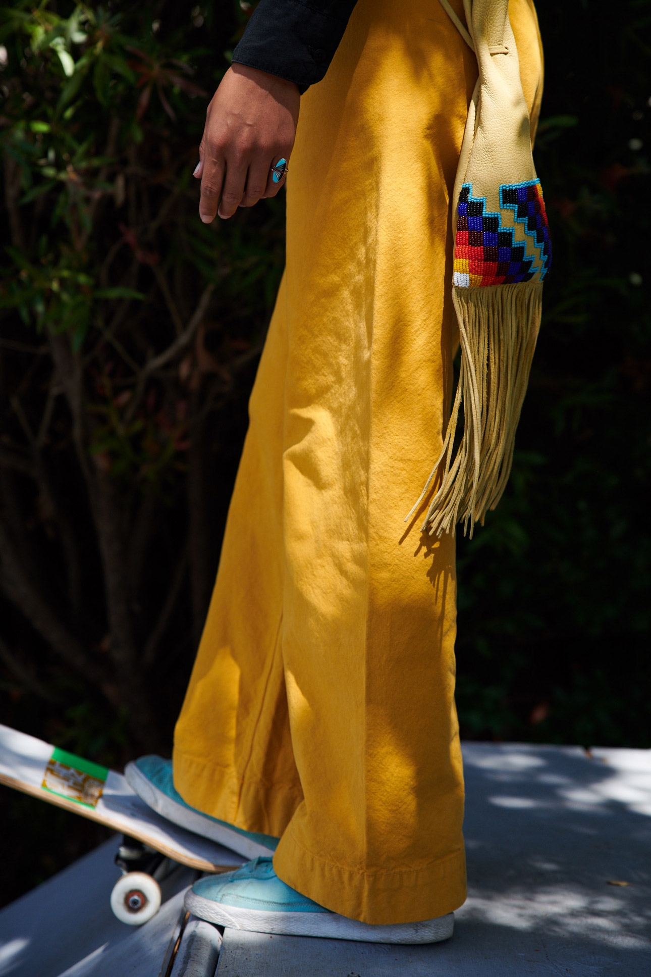 Moving to Phoenix Arizona from my reservation was such a rapid change. If it weren’t for Natalie Krishna Das, a pro skater, taking me under her wing and introducing me to Pattie McGee, I would have been very frightened to explore the city. Without those powerhouse women, I truly feel my style and resilience wouldn’t have been so noticeable. I have recently been influenced by the surf and skate style in the last two years thanks to Propel Skateboards’ Sicky Nichy.