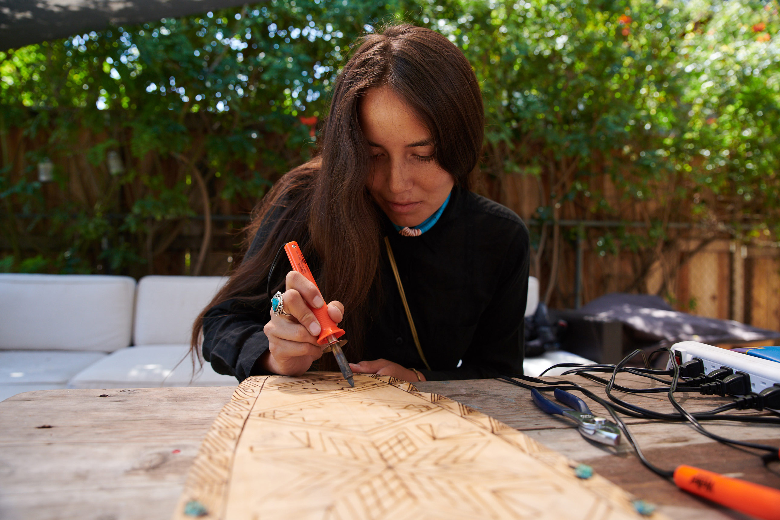 This is one of my favorite questions. When I am off my skateboard I collide both my lifestyles through woodworking and art. I do a contemporary traditional pow-wow dancing that involves many leg muscles and muscle memory relatable to the feet maneuvers of kickflips, ollies, and stabilization on a skateboard. I used my Navajo style wooden cedar flute skills directly on custom skateboard decks (cutting, sanding, woodburning and hand painting). The designs I incorporate relate to my nature, my favorite memories and sacred stories I hold from my great grandmothers down to mentors.